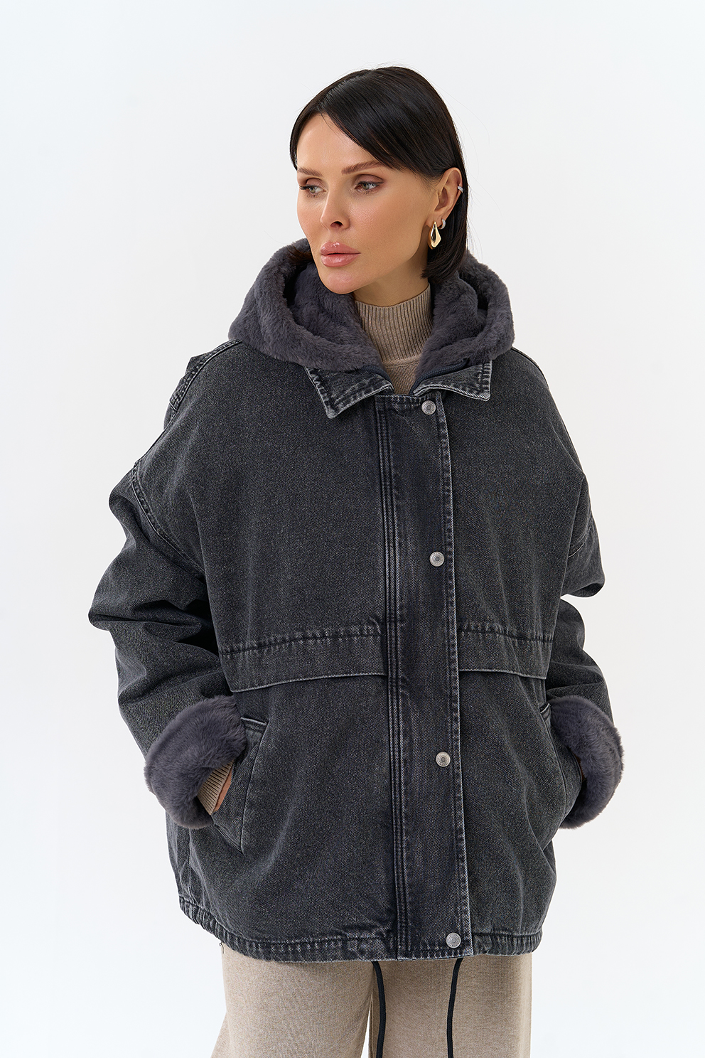 Крой воротника - съемный капюшон, отделка эко мех
