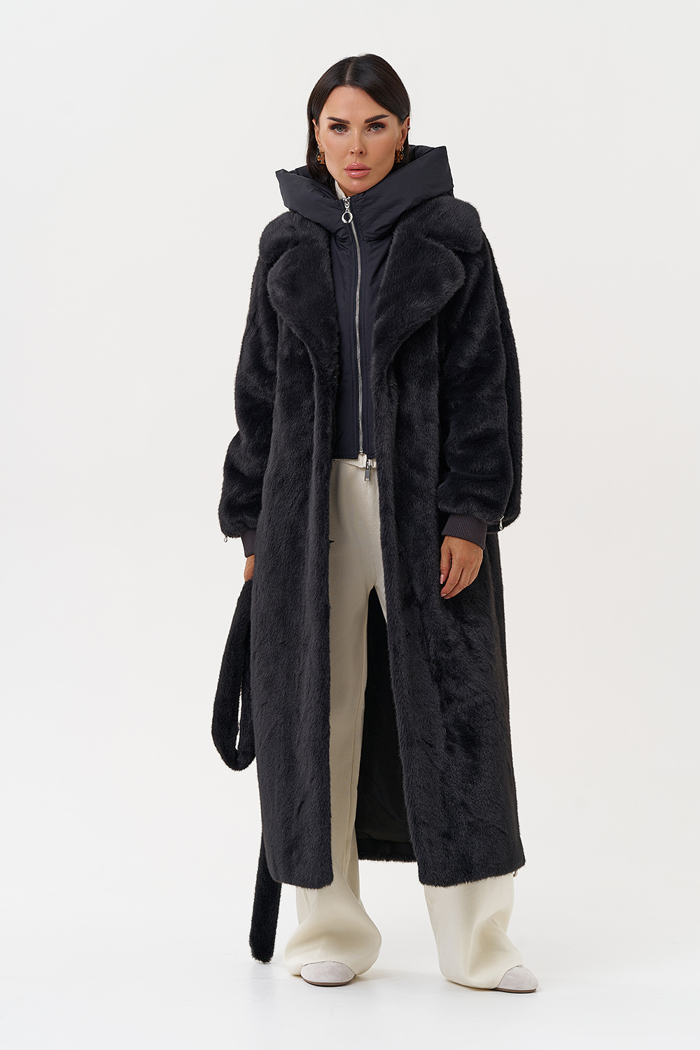 Фасон - прямой Длина изделия - 120 см Цвет - темно-серый (графит) Материал - экомех Состав полотна - полиэстер 100% Подкладка - полиэстер 100% Вид застежки - крючки, пояс Вид ворота - съёмный капюшон, английский воротник Фасон рукава - реглан, длинный |